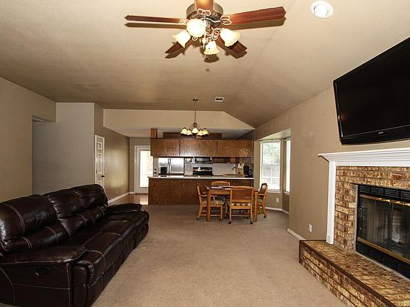 Move-In Ready! Open living area w/gas log fireplace. New carpet being installed, gas range, SS appliances, kitchen w/wood laminate floors, eat at bar, dining area w/bay window, large master w/glamour bath, his & hers closets. Storm shelter & storage shed.