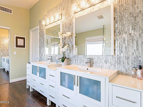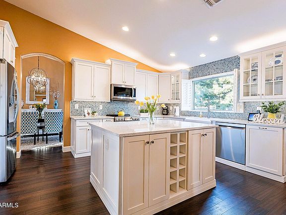 This gorgeous four bedroom Santa Rita Ranch home features stunningly remodeled kitchen and bathrooms! New roof in 2023! Engineered hardwood bamboo flooring in most areas. New tankless water heater in 2021. The kitchen features quartz counters, white shaker cabinets, stainless steel appliances and a custom glass mosaic backsplash. A large farmhouse sink overlooks views of the Superstition Mountains. The primary bathroom has new frosted-glass cabinets, a mosaic tile backsplash and accent wall, and modern stand-alone soaking tub. Mountain views, vaulted ceilings, and an ship lap-accented wall in the primary bedroom. Stacked stone accent wall in step-down family room. Covered patio and extended patio create the perfect backyard for entertaining. Three car garage with epoxy flooring.