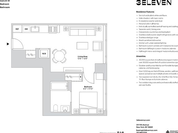 Every apartment at 3ELEVEN features an intentional design where every square foot of space is beautiful and functional in equal measure. The homes are open and spacious with ample room for sofas, dining tables and nightstands. The materials and finishes rival those found in condominiums, including wide plank wood flooring, quartz Caesarstone countertops, backsplashes and island waterfalls in the kitchens and custom vanities in the baths.