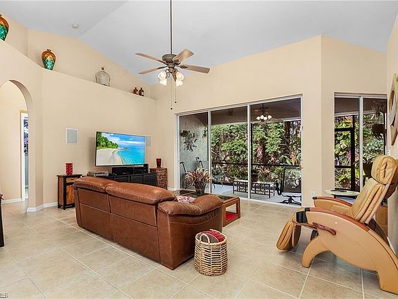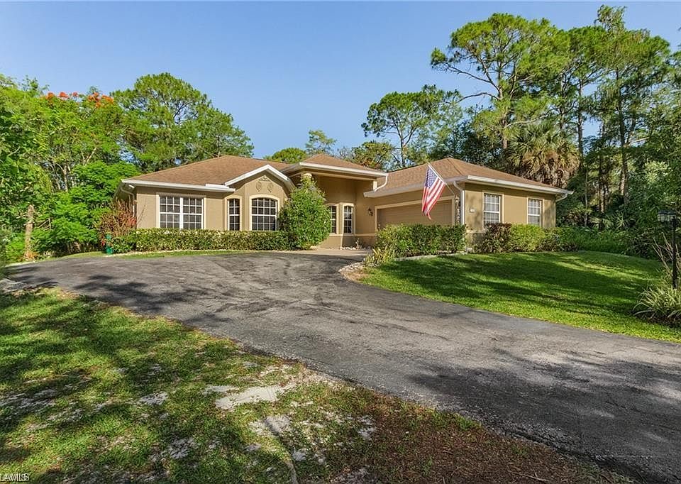 Look no further! This peaceful and unique tropical oasis has so much to offer. Abundant fruit trees including mango, starfruit, lemon, orange and grapefruit. So many features that enhance SW Florida outdoor living...private fire ring with Adirondack chairs, Tiki surrounded by nature, many sightings of wildlife including deer with fawns, beautiful birds, rabbits, squirrels and more. There's even room for short golf! The lovely 3 bedroom +den, 2 bath home offers views from every room. Master suite features large bathroom with shower, garden tub, his & her sinks and walk in closet. Kitchen offers plenty of cabinet space, breakfast area and bar. Side load extra large double car garage offers heavy duty tier shelving. Culligan whole house water system. Many updates...AC (2023), Roof (2023), Insulated Garage Door (2025) and hot water heater (2025). Enjoy the privacy while only being a short drive to all that Naples has to offer. Mirror in Dining room, living room TV and mount included with purchase. Dining Room Table and Chairs are negotiable