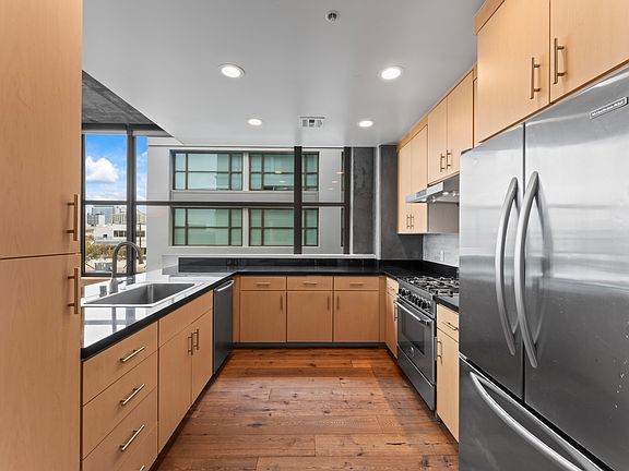 Modern Split Floor Plan at The Bond! Boutique Luxury Condos in Jack London Square Spacious two full bedrooms, two bathrooms (ADA access) plus bonus Den. Northwest-facing and light-filled, rare corner unit at The Bond! View sailboats and SF city skyline views from huge windows throughout the home. Interior features include; 9 1/2 ft. ceiling heights, exposed concrete elements, fresh paint, walk-in closet with built-in organizers, a soaking tub, a Bertazzoni range, hardwood floors, a Whirlpool washer and dryer in-unit, and central AC and Heat. The Bond is a mid-rise building with a solid concrete and steel build; showcasing simple luxury and classic design while honoring the industrial heritage of Jack London Square. Amenities include a Grand entry lobby with a full-time concierge to assist with packages, dry-cleaning services, pet services, and more. Also included are a 24-hour business center and gym, outdoor courtyard w/ BBQ, and 4000 sq-ft private dog park. Centrally located so commuting is easy. The building is high-speed connected with Webpass/Gggle Fiber and Monkey Brains among others. Minutes to freeway access, SF Bay Ferry, Amtrak, BART, and AC transit. Jack London Farmers Market happens every Sunday and locally you will find a plethora of breweries, wineries, cafes, and entertainment to choose from, plus an exciting variety of restaurants and bars. Please email to set up a showing. Owner pays HOA fees, water and trash, sewer included. Dedicated garage parking space.