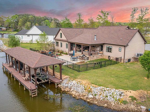 Experience luxury waterfront living in this custom-built estate on the Coosa River, nestled in Camden Cove Point and featuring a 2-slip boathouse with electric lifts, dock storage, and 290 feet of waterfront. An additional lot has been approved for a second dock. This 4BR, 3.5BA offers hardwood floors, crown molding, and custom cabinetry throughout. A spa-like master suite, walk-in shower, and custom closets. The chef's kitchen boasts granite countertops, a grand island, and a walk-in pantry. Upstairs features a large recreation room with an additional office/hobby room. Indoor/outdoor fireplaces and outdoor kitchen. Large 33x26 3-car garage and upscale exterior finishes complete this home.