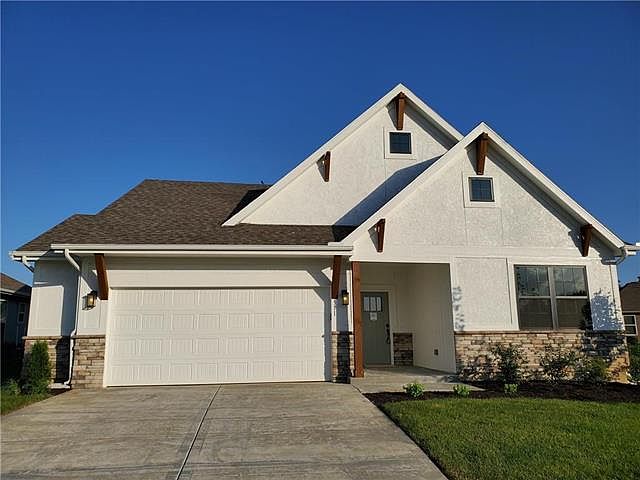 Beautiful ranch plan by Authentic Homes KC. Everything you need on one level, and upgrades galore! Main areas have luxury engineered flooring. Quartz counters in kitchen and both bathrooms. Kitchen has stainless appliances with gas stove/range, and walk-in pantry. Master suite has large bedroom & bathroom with double vanity, custom tiled shower, and walk-in closet. Extra storage space in garage. Built-in storm shelter options are available.