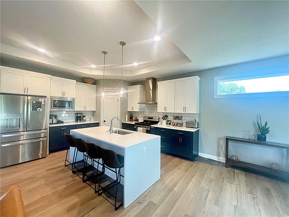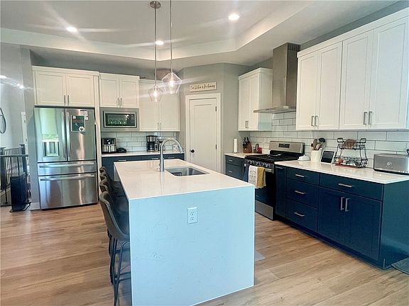 Private setting backing to trees in this great location close to the school and the city pool. This home has a 14 foot high entry foyer coming into the home with 5 bedrooms. Open concept with full stone fireplace on main level. Walkout ranch w over 3100 sq ft finished. 9' ceilings on Main/Lower level. Large mudroom w lockers and laundry sink .Quartz counters & maple cabinets with soft close drawers and doors throughout the home.Popular LVP flooring throughout main living areas. Huge lower level family room with wet bar with peninsula island , 4th & 5th bedroom & full bath. Walkout lot with nice daylight windows in the basement with tons of natural light. Lower level has a walkout to the patio. Home has a patio off this lower level. Home exterior is LP Smart siding. Arlo security included, passive radon, sump pump and many extra's in this home. All information obtained from Seller and public records.