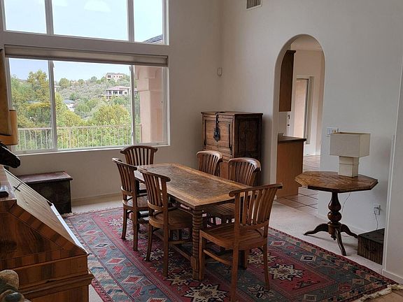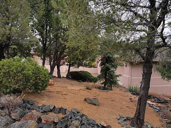 Unique custom home in the trees on three quarters of an acre and a seasonal creek; corner lot whose grounds are impeccably cared for. Located on a quiet cul-de-sac; with views and a level driveway-RARE in The Ranch at Prescott. Live on one level with cathedral ceilings and windows/views. Master Suite with tub and shower and dual sinks has direct access to the view deck. Gas fireplace in great room area and a formal dining room. In the large kitchen there is a desk area plus a breakfast nook that can seat 6. Laundry room is off the kitchen and the garage is level and aligned with the kitchen. Downstairs are two uniquely shaped bedrooms, a bathroom and a covered patio. One owner; plans available. Needs some tender loving care and upgrades but otherwise is very special.