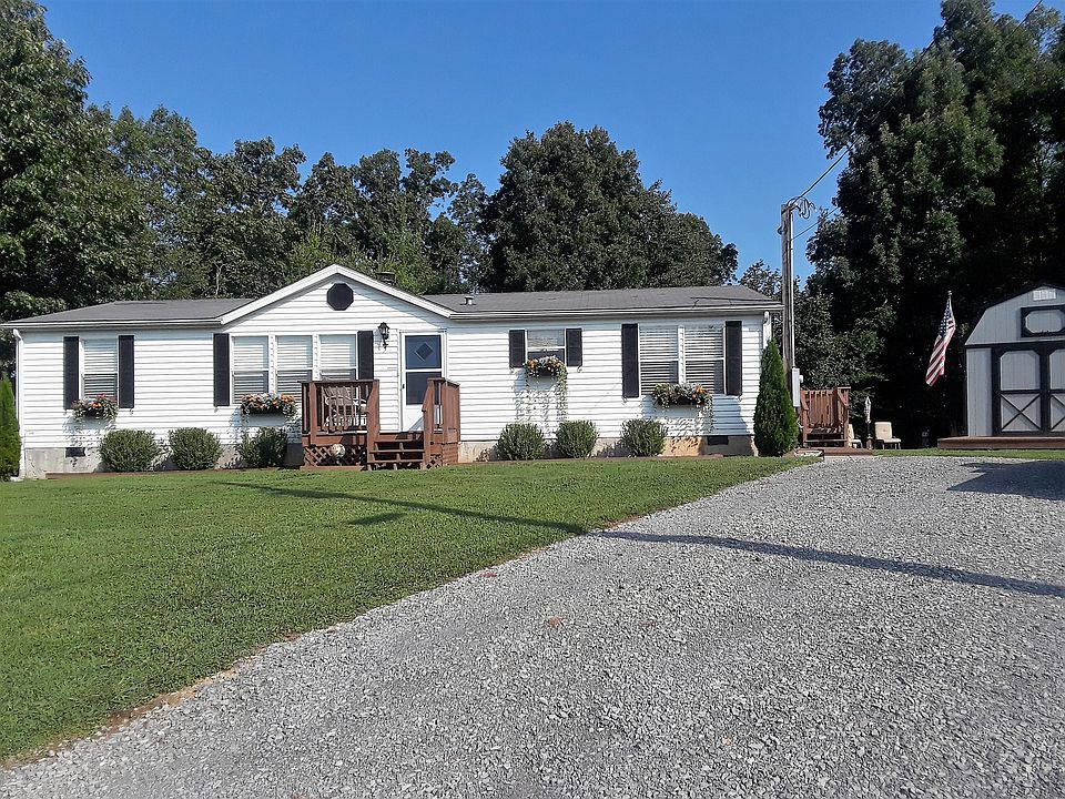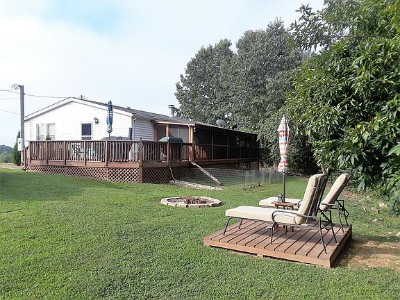 It is secured on a permanent block foundation w 2/3 acre on top of a hill with views. 3 bedroom-2 bath with a surround deck that is covered and screened in for about 3/4 of the length of the back of the home. Also has 10' x 16' work shop with top storage.