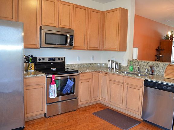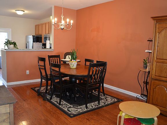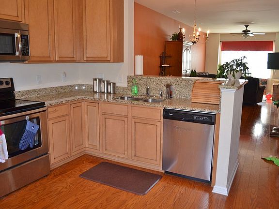 Beautiful townhome with great open floorplan. Wood floors in kitchen, living and dining rooms. Roomy kitchen with granite counters, stainless steel appliances, breakfast bar and double doors to deck. Large dining room and living room. Each bedroom has a private bath! Master suite includes dual vanities and two closets. Ground floor bedroom has sliding doors to patio. This room would make a great guest room or office. Oversized 1 car garage with storage space. Pull down attic access for extra storage. Community Pool. Perfect location in Cary Park. Close to everything you need!