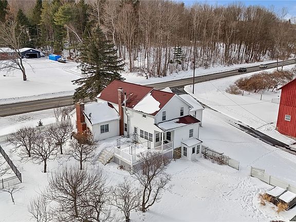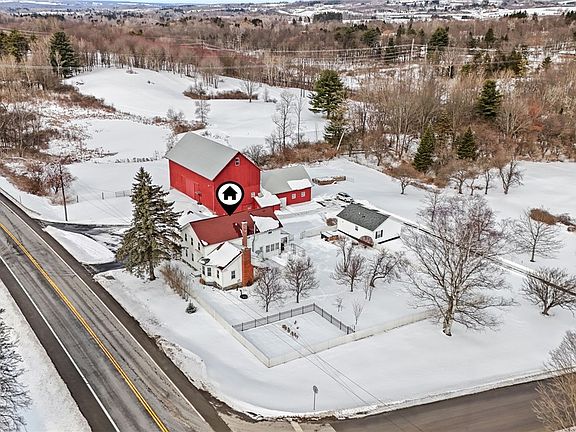 This is a once in a lifetime property: 4 BR, 2 BA house + 2 BR, 1 BA house + 3 Story Barn w/ workshop + newer Pole Barn addition, all on 16 acres with 2 ponds bordering the Dryden trail. Step into the charm of this meticulously maintained 4BR, 2BA farmhouse, where stunning original woodwork meets modern updates. First floor features an updated kitchen (granite counters & maple cabinets) with large walk-in pantry/laundry room, Formal DR, Bright LR w/ fireplace, Sunroom which leads to deck and enclosed fenced yard (perfect for pets) & primary BR w/ ensuite full bath. Upstairs are 3 BRs, another full bath, a bonus living room, & large storage attic. Below is a fastidiously maintained walk-out basement with an oil furnace & a wood furnace for LOW heating costs. The separate apartment house is fully upgraded w/ its own laundry, separate utilities, basement & deck; could also be used as a commercial office. The historic, cathedral like barn is perfect for holding events, also has it's own workshop with electric heat and plenty of space for animals in the lower level. The attached 28 x 44 pole barn (built in 2014) with cement floor, electric, and 2 garage doors (12 x 12 and 10 x 10) is the perfect storage for a collector. Endless outdoor activities: fishing the pond stocked with small & large mouth bass, picking from the raspberry & blueberry bushes & fruit trees, star gazing in the hot tub, or hiking the property trails right over to the Dryden trail. Buy with confidence! Ask your agent for the recent structural inspection and for the 3 page list of improvements.