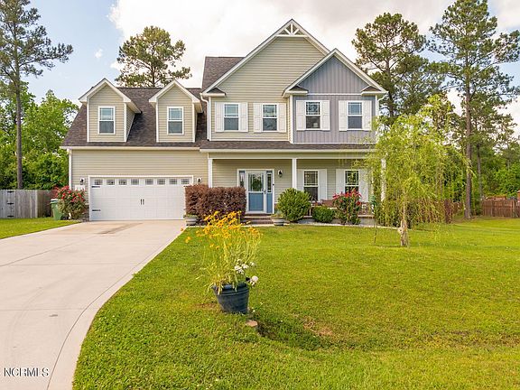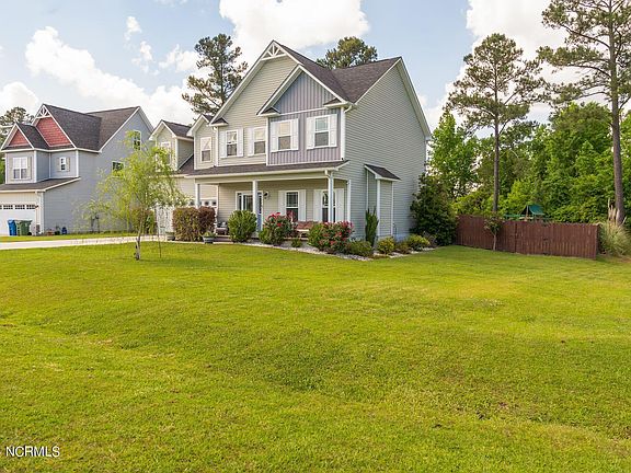 Looking for a great home in a great neighborhood near MCAS New River? This centrally located home is waiting for new owners. Come check-out this 4 bedroom, 2.5 bathroom home on 0.70 acre lot with a 6' privacy fenced backyard. The Sellers of this Tall Pines of New River gem have lovingly maintained this home since it was built in 2016. The main entry foyer contains a large closet for extra storage; the foyer opens through an archway to the living room with an electric fireplace. Beyond the living room is the dining area and kitchen combo. This space allows interaction between living spaces while preparing meals or entertaining. There is also a built in desk, perfect for those WFH remote jobs. The kitchen comes complete with all appliances, to include the refrigerator. The downstairs hallway to the 2 car garage houses your pantry, another storage closet, and ends with a half bathroom. Upstairs, you will find all 4 bedrooms with two full bathrooms. The primary bedroom features two seperate large closets for all your clothes, shoes, and accessories. The en-suite bathroom has a soaking tub and a seperate shower stall with a vanity containing two sinks, enough room for everyone to get ready in the morning. There are three additional bedrooms and another full bathroom complete with a dual sink vanity. The upstairs laundry room with built in storage cabinets is amazing. The washer and dryer, along with the TV mounts, and garage storage shelves will convey with purchase. Outside the sliding back door is your back yard oasis complete with a garden, children's playground, and a storage shed for all your lawn and garden needs. A 30 Amp service outlet is available in garage. For peace of mind, the Sellers are offering a 14 month home warranty through Home Warranty Inc.