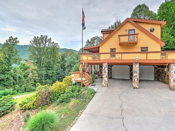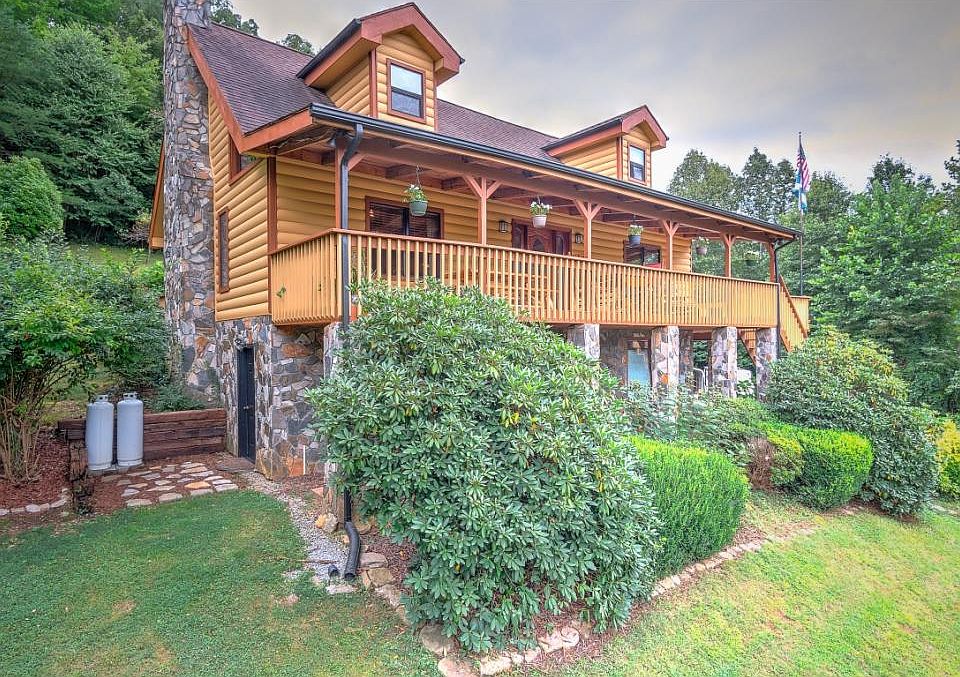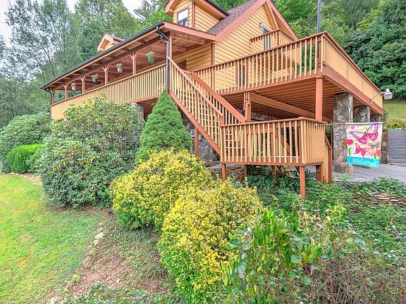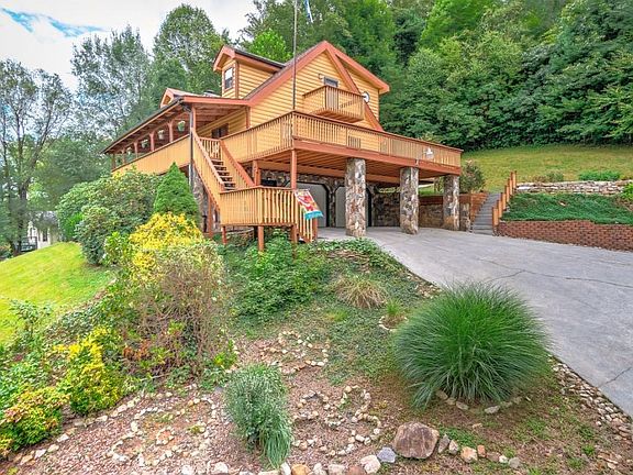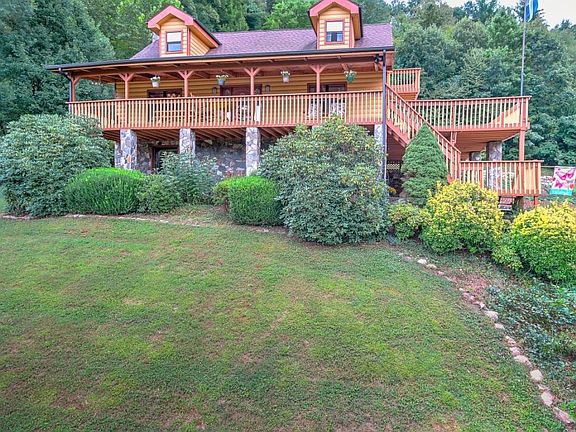 Looking for mountain views, privacy and move-in ready? Welcome home ! This gorgeous two story log home offers 2 bedrooms and 3 full baths on a double lot framed with mature trees, vegetable and fruit gardens and lush landscaping. Enjoy your morning coffee on the covered front porch or entertain on the oversized wrap-around deck. The main living area boasts hardwood floors, exposed beam ceilings up to the second story and stone fireplace for cozy evenings. Large windows and skylights invite in warm natural light. Open concept kitchen offers ample cabinet space, solid surface countertops, island with built-in storage baskets and black appliances. New black stainless refrigerator has a 10 year transferable warranty and will convey to the new owner. Bedroom on the main level could be used as a master with adjacent full bath. The second level loft is bright and inviting with its own private balcony and attached full bath complete with a large closet, oversized vanity and jetted tub with stone surround. Downstairs area is perfect for a den, office or third bedroom with lots of natural light, full bathroom and stone fireplace. Wall mounted television and mini fridge are ready for game day or guests. 2 car drive under garage space can be used for car parking, workshop or additional storage. The entire exterior of the home including body,trim,porches,railings,gutters and exterior doors has been freshly painted using Benjamin Moore Arbor Coat with UV protection. Weather Tamer roofing carries a 50 year warranty that is transferable to the new owner. Double outbuilding provides generous space for all of your yard care and gardening needs while oversized steel carport is ideal for additional vehicle parking or storage. Enjoy the peace of the mountains while being just minutes from Elizabethton and Watauga Lake. Large grass shrub at driveway curve and curtains inside the home do not convey. Information deemed reliable but not guaranteed,sq ft approx buyer/buyer's agent to verify.