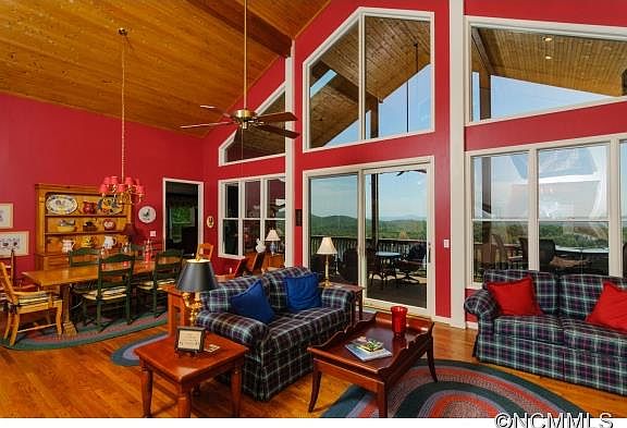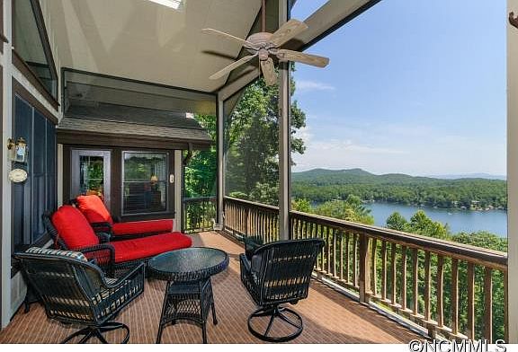 Estates best lake views. Panoramic views of the Balsam Range and the mountains surrounding the lake. This home has an open floor plan with dual master bedrooms each with large walk-in closets and private baths. Vaulted ceiling and stone fireplace make this home very inviting. The sunroom/office off the dining room has a spectacular view. Enjoy the cool summer breezes from the large screened porch. LM-44.