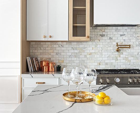 Interior finishes have been thoughtfully designed to appeal to any aesthetic. Picture moldings, wainscoting, an oak staircase, and a decorative Calacatta Gold fireplace provide a timeless backdrop for whatever your aesthetic. The chef's kitchen includes a large dining and prep island, Bertazzoni appliances, an apron-front farm sink, brass fixtures, and a full wall of custom pantry space to complement the rift oak and white custom cabinetry and marble mosaic backsplash. The main floor bathroom riffs on the contemporary classic vibe and includes a walk-in shower with Carrara marble walls and floors, and oil-rubbed bronze fixtures. Black casement windows throughout the property lend an industrial yet historic vibe that warms up the house from the inside-out.