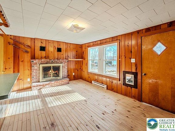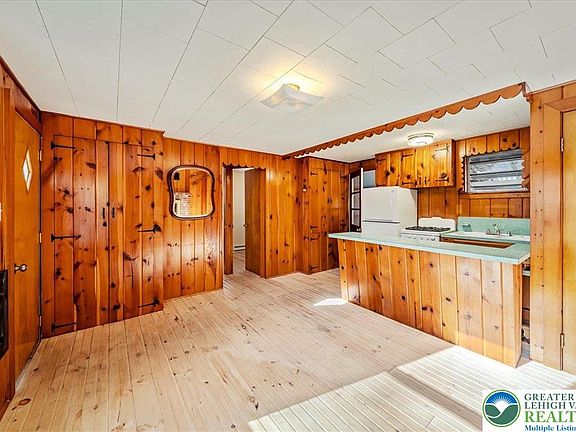 Do not wait to see this charming lakeview escape in the Monroe Lakes community of East Stroudsburg, where classic Pocono character meets peaceful woodland surroundings. This cozy two-bedroom, one-bath cabin has been lovingly maintained and captures the essence of a true mountain retreat. Step inside to find original craftsmanship throughout, from the warm knotty pine walls to the detailed wood trim that reflects timeless quality. The inviting living area centers around a brick fireplace, perfect for cozy evenings after a day by the lake. The kitchen features a working vintage Caloric gas stove, mint-green countertops, wood cabinetry with scalloped accents, blending nostalgic charm with everyday function. Both bedrooms make clever use of space with built-in storage and cozy sleeping nooks, while the screened porch and wooded lot invite outdoor relaxation. With partial lake views and access to beautiful Lake Monroe for fishing, kayaking, and swimming, this home offers a serene backdrop for weekend escapes or full-time simple living. Recent updates include a sharply painted exterior and brand new pine floors. Conveniently located near Route 80, downtown East Stroudsburg, and area attractions, this affordable cabin offers a rare opportunity to enjoy the best of Pocono living. Sale includes additional lot next door for added privacy and space! Priced below $90,000, this hidden gem won't last long - schedule your tour today!