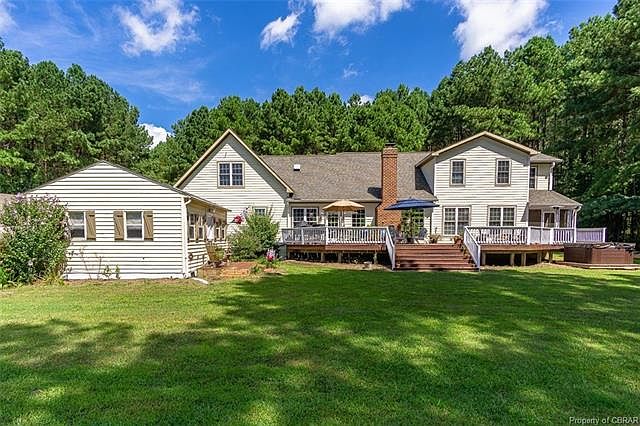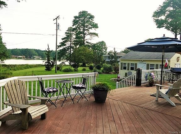 Beautiful water views of Stutts Creek and a short walk/golf cart ride to the Mathews Yacht Club. This stunning custom built home has loads of privacy and a lovely long drive to arrive at this paradise. From the moment you walk in you'll see the quality and love that has gone into this home. The detail of the crown molding, hardwood floors and gourmet kitchen with the professional range exude luxury. The kitchen is a chef's dream with high end cabinets, huge center island, stainless steel appliances, granite counter tops, extra prep sink and walk in pantry. This very open floor plan has a brick wood burning fireplace in the living room, formal dining room and walkout to large rear deck with hot tub. The first floor primary bedroom suite has large walk-in closet, bathroom with double vanity, separate shower & champagne tub, plus a private screened porch. There is a first floor office, utility room with a deep sink, fully shelved storage room & half bath. Upstairs has 2 bedrooms & guest bath. There's a FROG room with bar and rec room, large walk-in attic . Includes guest house & studio. Guest house has kitchen, living room w/gas stove, bedroom loft, full bath & kitchen.