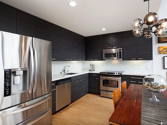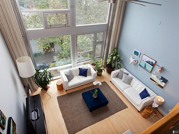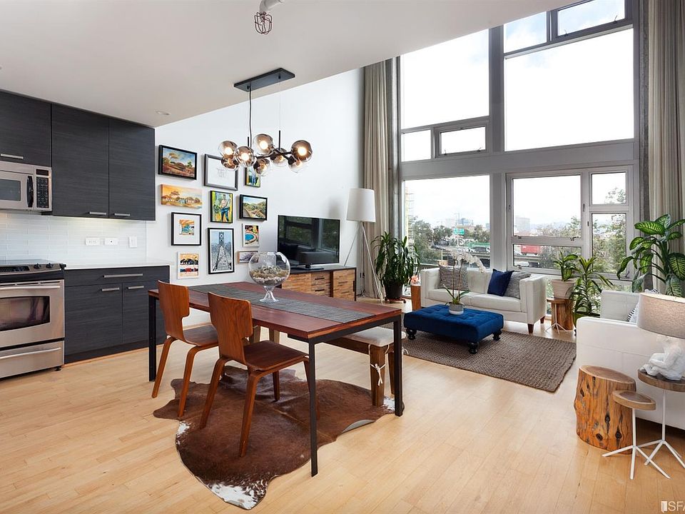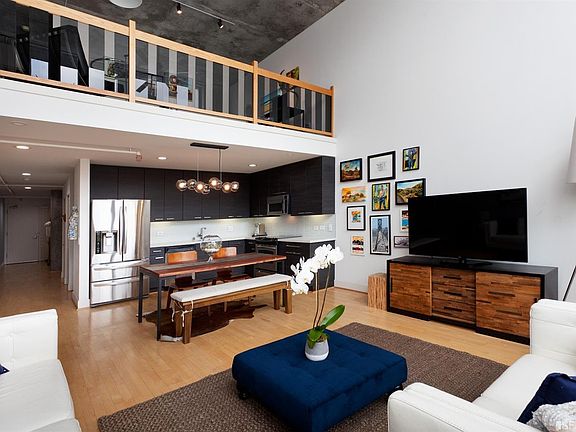 This spacious loft features 2 bedrooms, 2 bathrooms and a generous mezzanine loft. Floor to ceiling windows stretch up 18 feet allowing generous light to stream in. The kitchen has been recently remodeled with new backsplash, refaced cabinets and stainless steel appliances. The master bedroom opens onto a deeded patio looking out to the community pool. The Sierra at Jack London Square has been a highly sought after building since its construction in 2003. It offers many wonderful amenities including a heated pool, sauna, media and games rooms, two-level state of the art fitness center, and 24/7 front desk staffing. Situated only a few blocks from the Lake Merritt BART station, a transportation dream. Near dining, shopping, and entertainment