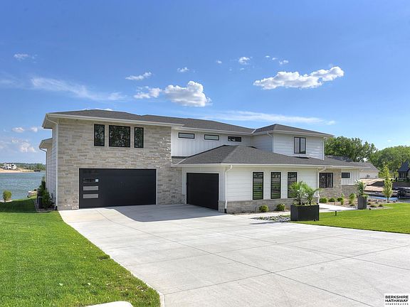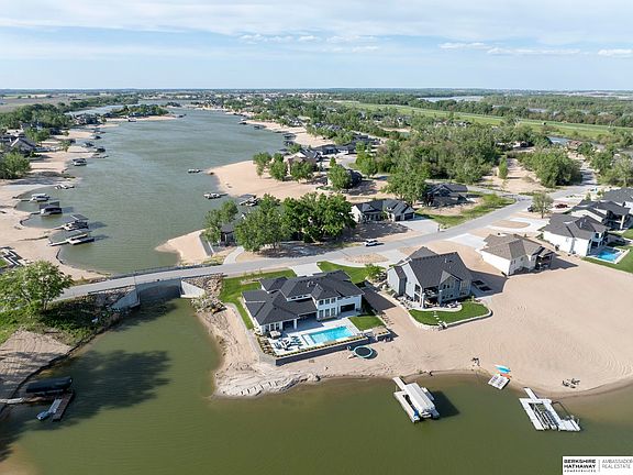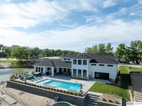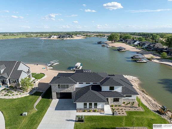 Welcome to Sandy Pointe, where luxury meets lakefront living in Nebraska's premier community. This spacious lake house spans nearly 5000 sq ft and boasts large bedrooms, a chef's kitchen with a walk-in pantry, and a living room overlooking the water. Entertainment is a breeze in the lake room, featuring a sunken bar, cozy fireplace, and ample seating. Outside, enjoy massive garages for boats, UTVs, or golf carts, with convenient access to the pool, hot tub, and fire pit, all steps from the lake. With four bedrooms, six bathrooms, and a versatile media room, this property offers the epitome of lakeside luxury. Indulge in comfort, convenience, and endless recreation in this stunning lakeside retreat.