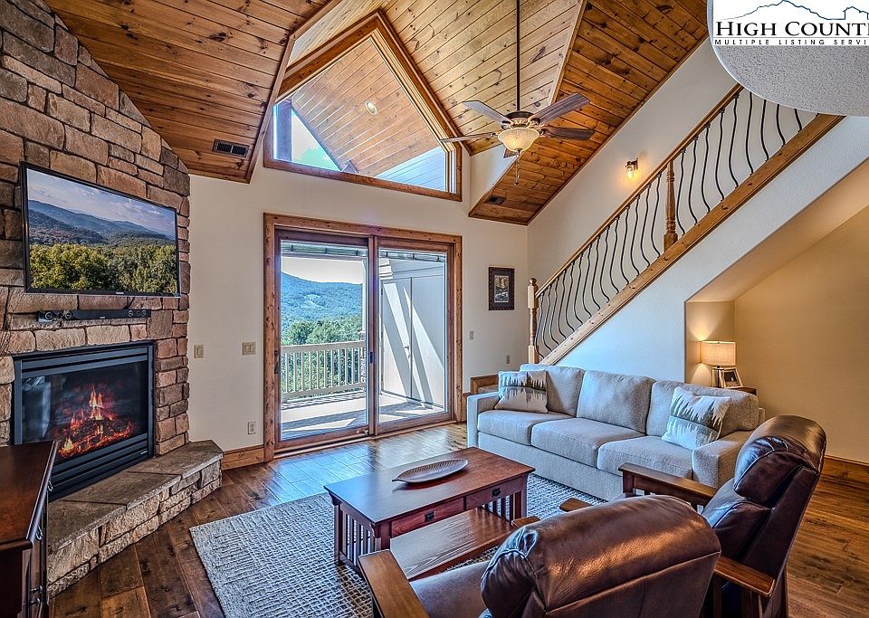 Shows Like New Upper 2 Story Condo with Unobstructed Panoramic Views of Grandfather Mountain. Close proximity to Town, Ski Resorts, Restaurants, Hiking, Shopping, Parks, etc. Temps average 75 degrees in the Summer months. Beautiful Gourmet Kitchen w/ Granite Countertops, Newer Gas Range & Oven (Natural Gas), Over-size Closets, Walk-in Laundry/Pantry Room, Stone Gas Fireplace, Outdoor Covered Private Deck, Stone Travertine Shower, Jetted Whirlpool Tub, Builder Upgrades, Natural Light, Very Energy Efficient. Natural Gas Community. Monthly Utility Bills Very Reasonable! Being offered Furnished minus Seller Exclusions. Please note 30 day min. on nightly rentals. Must See To Truly Appreciate The Quality to Detail in this Beautiful Condo. Stair Access Only.