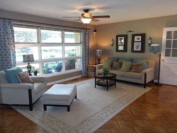 Modern updates throughout this 3 bedroom 1.5 bathroom Ranch including decorator lighting and fresh paint. Open concept dining/living room has beautiful hardwood floors and large picture window. Large pantry and included appliance package in kitchen. Cozy family room has gas fireplace. 3 bedrooms all with large closets. Convenient half bath and remodeled full bath has double vanity and new flooring. Full basement is partially finished and holds many possibilities for a recreation room or more living space. Basement also has workshop and laundry areas. Double lot with fully fenced portion.