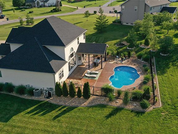 Impressive custom built 1.5 story home on 1.13 acre lot. Enter into a grand 2 story foyer open floor plan W/ separate dining room, cozy gas fireplace along with a stunning wall of Palladian windows that opens up the whole living room with an excellent view of the inground pool. Bright dazzling kitchen has gorgeous solid white countertops, 42 white cabinets, crisp backsplash along W/center island & desk area. Stainless steel appliances. Main floor master bedroom suite includes coffered ceiling & ceiling fan. Luxury bath W/ double bowl vanity, separate jet tub & shower and walk-in closet. Enjoy the peaceful backyard with in ground pool along with a marvelous covered patio, shiny stamped concrete with gorgeous landscaping and sprinkler system for the whole acre lot. Lower level is stunning W/ family rec room, electric fireplace and built-in bar. Enjoy every woman's dream room, yes a room for shoes or crafts. Additional nice size bedroom, updated bathroom & plenty of extra storage space.