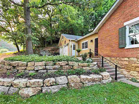 Charming 3 bed, 2 bath Galena Brick with original portion dating back to around 1840 and once featured on the 50th Tour of Historic Homes perched on .45 acre homesite offering a beautiful setting with lush treed backdrop, manicured yard and convenient location to downtown Galena. Dubbed the Peter Specht Home after the original owner, the house mixes an original brick portion with the feel of yesteryear and a gorgeous modern frame section and garage added by current owner. Approach the covered front porch that spans the width of the house to find the ornate wood entry door with etched glass steamboat scene opening to foyer that feeds to main level featuring large living room with gorgeous refinished original flooring, formal dining area with wall mural of home done by local artist and skylights above for added natural light, delightful kitchen with loads of cabinetry, room for eat-in table, and pantry area that also passes through to cellar, cozy guest bedroom to front (currently used as office) with shared access to full bath with clawfoot tub, built-in storage, and pedestal sink, and additional guest bedroom with display wall of shelving. Addition houses laundry room with sink, folding counter, storage cabinetry and built-in desk area, and spacious master suite with dramatic cathedral ceilings, beamed accents, walk-in closet, direct access to paver patio, and stunning master bath with tile floors, beautiful vanity with glass door upper cabinets, bead-board accents and huge tile surround shower. Attached two car garage has wall heater, plenty room for vehicles and storage, and attic for storage above with pull down interior and exterior door access. Unfinished attic space above home offers a huge space for storage or future expansion. Enjoy the outdoors from the generous paver patio adjoining rock retaining walls and planter beds, additional concrete patio area off garage entry side, and relaxing covered front porch. Grounds are highlighted by beautifully manicured lawn with gorgeous landscaping, storage shed built to mimic an outhouse, stone accents, and treed hillside. *Parcel is irregularly shaped. Please see GIS map for approximate dimensions. Age of home is approximate per seller.