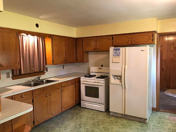 Over a half acre lot in town! Large home with great curb appeal and charm. Possible three bedroom plus. Large kitchen lots of cabinets Newer fridge and stove stay..Large laundry room. Dinning and living room have beautiful original hard wood floors. Upstairs has 2 rooms w/original hard wood floors. One HVAC IS 2015.Great detached 1 car/workshop w/concrete floors and electric.Great clean and dry storm cellar. Asphalt drive mature trees make for a park like setting. AS IS . A FEW things here and there Priced according.Fire place and stove have never been used by thees owners...