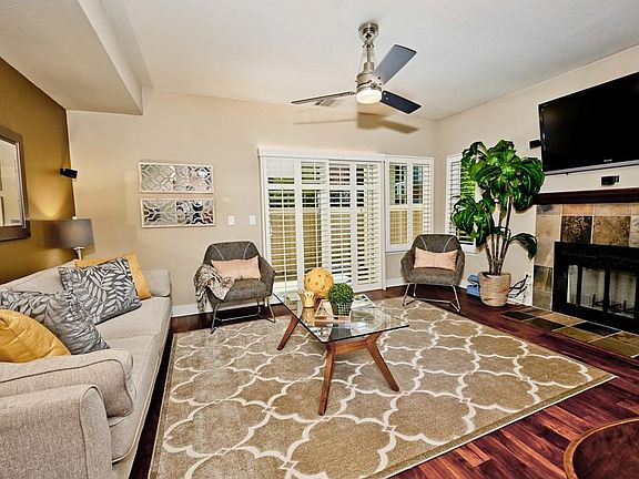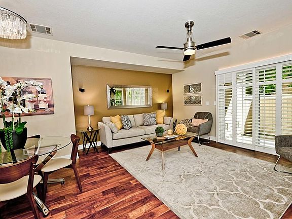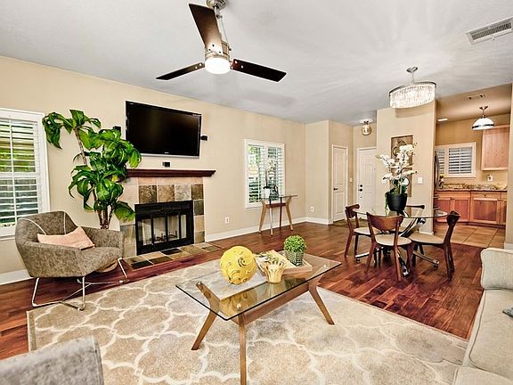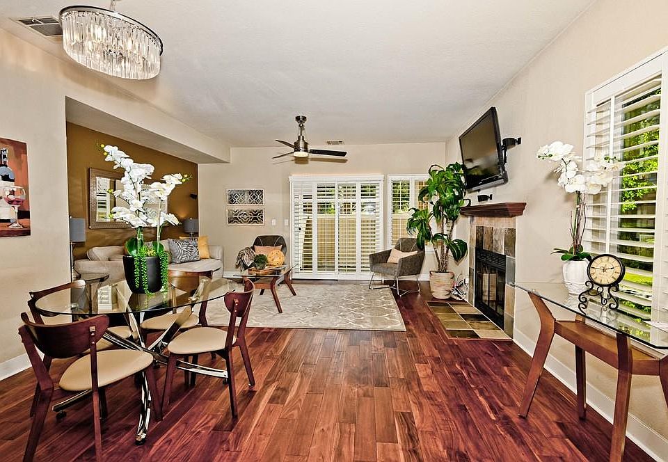Tranquil,Tahoe-like setting within minutes to City Center with movie theater, restaurants and shopping. This 2 bedroom 2 bath condo on the ground floor boasts hardwood floors, plantation shutters, wifi compatible lighting, granite countertops in kitchen and bathroom vanities with solid stone countertops. Large bedrooms with ample storage. Private patio. Large oversized garage. 24 hour security guard, tennis courts, 2 pools and spas, new gym and walking/jogging trail. Close to freeway access, Central Park and Iron Horse Trail. Top rated SRVUSD school district.