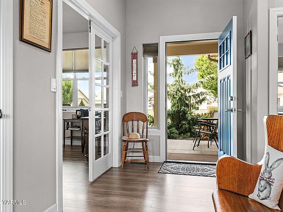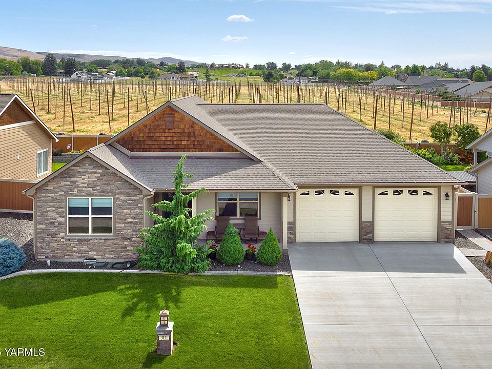 Welcome to this beautifully crafted home in the gated 55+ community of The Villas. This lovely 1,838 sq ft home features 3 bedrooms and 2 bathrooms, with a layout designed for both comfort and easy living. As you enter, you're greeted by two spacious bedrooms and a full bathroom right at the front of the home--perfect for guests or a home office. The hallway opens up into a bright and airy living room with a cozy gas fireplace and plenty of natural light. The living room flows into the open-concept kitchen, which features gorgeous quartz countertops, beautiful cabinetry, newer stainless-steel appliances, a breakfast bar, and a dining area that leads right out to a covered back patio with peaceful views of the nearby hop fields. On the other side of the home, you'll find the private primary suite with a large walk-in closet and a beautifully designed ensuite bathroom that includes double quartz sinks and a tiled walk-in shower. This home also includes a double car garage, covered porches in front and back for enjoying the outdoors in comfort, a fenced backyard with a full sprinkler system, and a drip-lined garden area that makes gardening low-maintenance and enjoyable. The Villas community also features a welcoming clubhouse with a social calendar full of activities, giving you the chance to connect with neighbors and enjoy an active, relaxed lifestyle. You'll love the peace of mind that comes with living in a secure, gated neighborhood, along with all the thoughtful details that make this home truly special. Schedule your showing today before this beautiful home is gone!