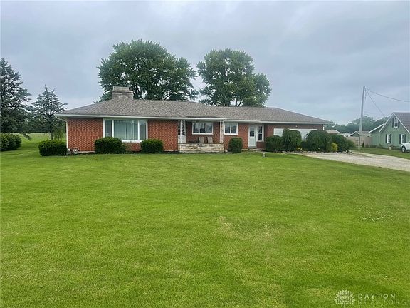 Full Brick Ranch provides country living with modern updates. The property is conveniently located in Concord Township between Troy and Tipp City. The home features an open floor plan with a newly renovated eat in kitchen with center island, subway tile backsplash, stainless steel appliances and ample cabinets. The large family room features a stone fireplace and large picture window for natural light and original hardwood floors. The hardwood floors flow into the hallway and two bedrooms. The hallway bathroom has a large countertop and built in cabinets. The split bedroom floor plan is ideal for relaxing times in the primary bedroom. The large primary bedroom was remodeled in 2009 and features a walk-in closet and full bath. It is large enough for a cozy sitting area. The two additional bedrooms are large with lots of natural light, and each have large lit closets. The unfinished basement has an additional fireplace and offers many possibilities. The back yard provides the perfect gathering spot with a patio, bar area, brick grill, hot tub and large gravel area for a fire ring. The 30' X 40' pole barn/garage is large enough for three cars and has an enclosed woodshop. There is a 20' X 20' barn at the rear of the property. It has a roll up door, loft, electricity and water. The barn and area to the rear of the property would be a perfect place for small animals or 4H projects.