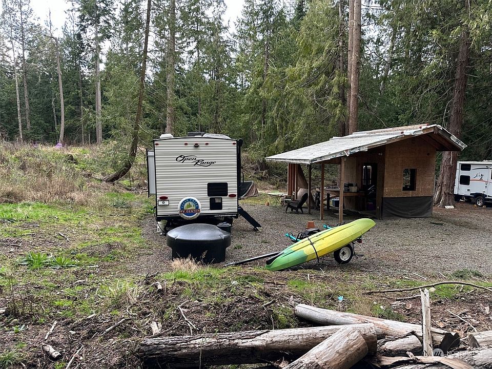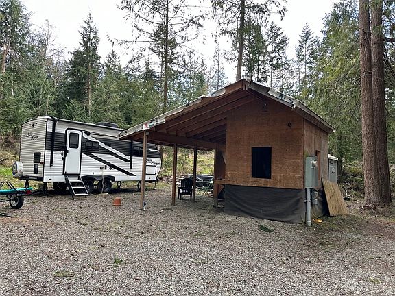 Do you dream about having five acres surrounded by a gorgeous forest, birds and critters? This spot is cleared and ready for you to begin the process. Small shed is a place to store stuff and prepare your breakfast. Septic permit is being renewed for a 2BR conventional system. Well estimate in documents. Electricity is installed. There are two travel trailers on the property- one is for sale at $25K. The Coyote trailer belongs to a friend- do not disturb. There is water storage with a pump and a sanican. Building site is uphill. Wood harvested from the property is dry & stickered- Western red cedar & Doug fir flooring. Bldg. plans, wood & trailer available, but extra. Please make a Showing Time appointment. Minutes from Port Townsend.