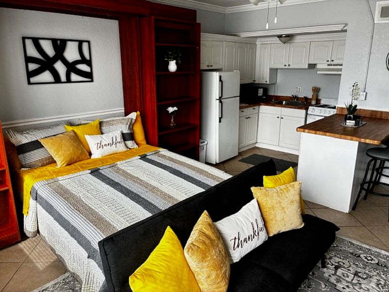 unit 810 - Furnished Studio Apartment in City Place Condominiums with build in Murphy Bed right in the heart of downtown Jacksonville. NEW paint everywhere! The gated building has several elevators, a fitness center, a community laundry room, plus a resident clubroom. This location is somewhat walkable to restaurants and public transportation.