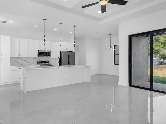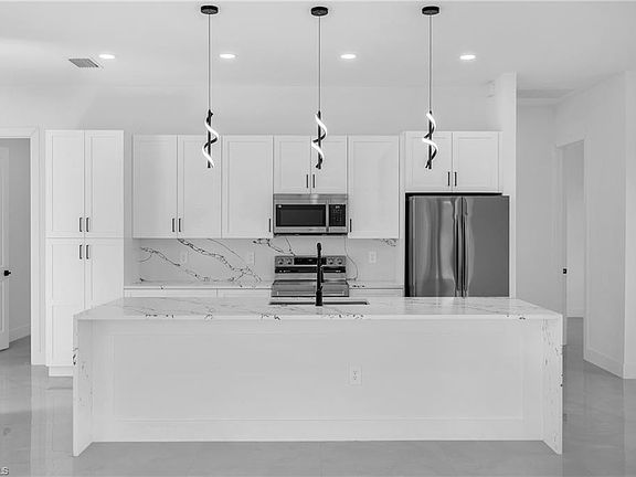 Introducing this beautiful new construction home located in the heart of Lehigh Acres, offering 4 bedrooms or a flexible 3-bedroom + den layout and 3 full bathrooms. This residence features stunning quartz countertops, a waterfall kitchen island, tray ceilings, recessed lighting, and porcelain tile flooring throughout. The master suite includes a dual sink vanity and a luxurious waterfall shower head. Impact-resistant windows and doors provide added security and energy efficiency. This property is one of four identical new-construction floor plans available from the builder. This home is ready for offers and a new owner!