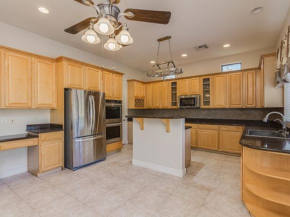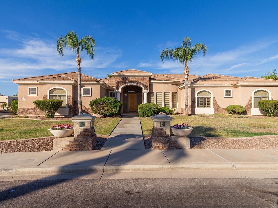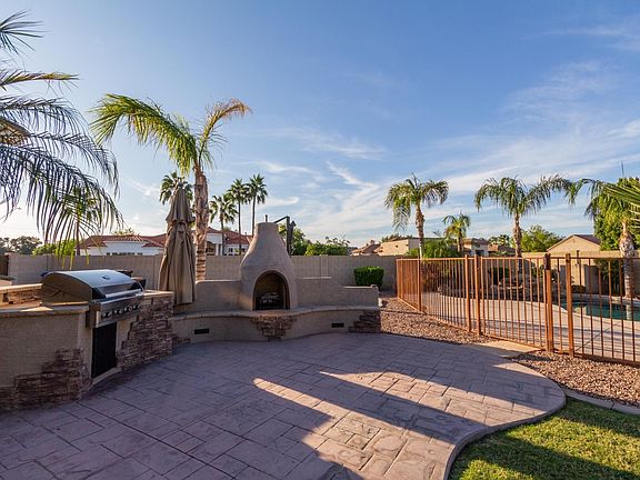 Gorgeous curb appeal on this 6 bed, 3.5 bath basement home in highly desirable Kensington Groves. Spacious floorplan features 4 bedrooms w/jack & jill set up upstairs & 2 bedrooms w/full bath in basement. Gourmet kitchen has granite counters, built in wine rack, farm sink, dual ovens, cooktop, walk in pantry & hanging pot rack. Other home upgrades include plantation shutters, stack stone gas fireplace & wood/iron stair railings. AZ outdoor living at its best in this large backyard featuring extended covered patio, sparkling fenced pool, gas BBQ & fireplace seating area, sport court, grassy area & citrus trees galore! 3 car garage has built in cabinets, overhead storage & a large storage closet. Priced accordingly for a new owner to make this beautiful home their own w/new flooring & paint.