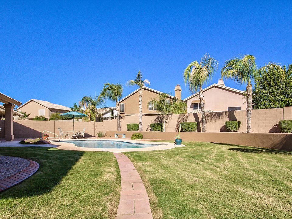 This is the one! Fantastic single level in popular TW Lewis neighborhood situated on amazing 11,204 cul-de-sac lot! 3 bedrm PLUS office. Gorgeous wood floors,beautiful upgraded tile. Check out the large kitchen with tons of cabinets,granite counters and kitchen island. Granite in bathrooms, as well. Family room has gas fireplace and wet bar. Plantation shutters throughout. Large master bedroom with exit to backyard. And wait until you see the backyd.Lush landscaping with lots of grass, side yard has 5 citrus trees and garden, pool has been resurfaced and newer energy efficient pool pump. NEW ROOF, NEW EXTERIOR PAINT. Garage with epoxy floors & built-in cabinets, sink in spacious laundry room.