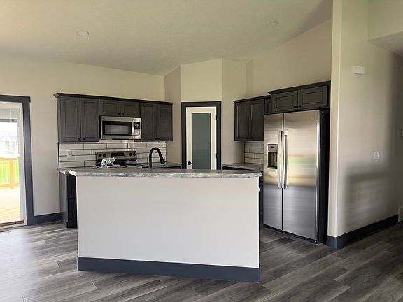 Brand new construction! Nice open floor plan with a total of five bedrooms, three bathrooms. Vinyl plank flooring, Pella windows, kitchen appliances included, 9' ceilings, tray ceiling in master bedroom and 2nd main floor bedroom. Beautiful kitchen with soft close drawers & cabinets and pantry. Covered front porch, covered 14x16 deck, underground sprinklers, edging, rock, and sod. A must see!
