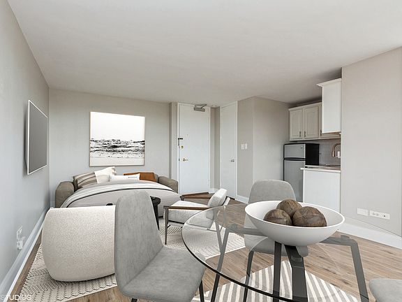 Great west-facing studio on a high floor in the heart of East Lakeview! Many recent updates with one indoor garage parking space included! In 2023 New floors and trim installed, newly painted and bathtub reglazed. In 2021, new air conditioner and new hot water heater. Kitchen with white cabinets and quartz countertops, white bathroom with granite. Large 8'x5' walk-in closet. 21st floor rooftop deck and pool with gorgeous views of the lake and grills. First floor of building includes bike room and newly remodeled laundry room with new washers and dryers. Phenomenal location minutes away from Wrigley Field, Belmont Harbor, Lake Michigan, Lincoln Park Zoo, restaurants, shops, etc. Bus stop in front of building w/express bus to Water Tower. Strong reserves. Parking space currently being rented month to month. Unit must be owned for two years before it can be rented.