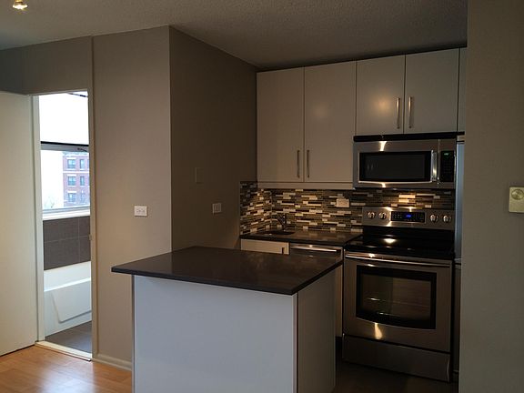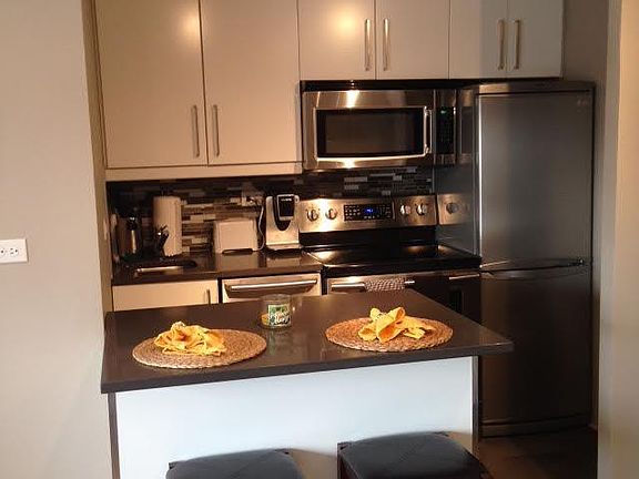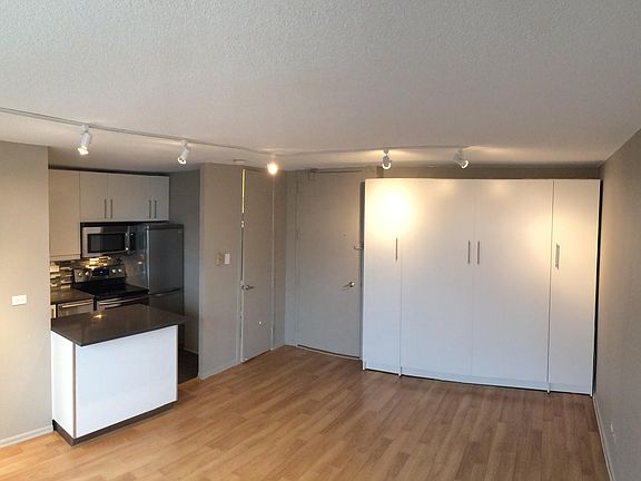 This bright, highly upgraded condo studio is perfectly located just a block from Belmont Harbor, Lincoln Park and Lakeview's shopping, restaurants and nightlife. Express buses a block away will take you downtown in 15 minutes. Internet and Cable are included. - Well maintained, secure 20 floor condominium building with on-site engineers - Unobstructed 7th floor west view - Large walk-in closet (5' x 3.5') - Dimmable track lighting - Quartz counters in kitchen/bath - High-end stainless appliances incl. dishwasher and over-oven microwave with exhaust - Italian porcelain tile bath with radiant floor heat - Custom euro style wall bed (for queen size mattress) includes 2 additional side closets - easily folds away to provide flexible use of living space (15 x 13 ft.) - Blackout shades - Airconditioner - Programmable thermostats for main room and bath - Roof top pool, sun deck, and grills - Onsite laundry and cleaners - Bicycle storage - Rental parking available. $150 move in fee required by condo management association