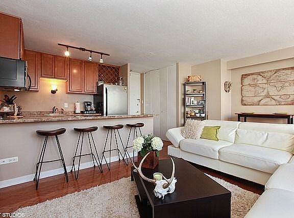 Unit 904. Sunny updated 1 bedroom condo with lake views in south east Lakeview. East windows allow light to fill the rooms while enjoying views of the lake and Belmont Harbor. Kitchen has been updated with stainless steal and wood cabinets. Huge bedroom complete with a walk in closet. Newer water heater. Bathroom shower tile, tile floor and toilet new in 2016. New paint throughout (trim and doors included) and new Carpet in bedroom and closet. Building offers a rooftop deck with grills and a outdoor pool (access available for an additional fee). Laundry room in building. Attached heated garage parking included in "make me move" price. Leased until end of March.