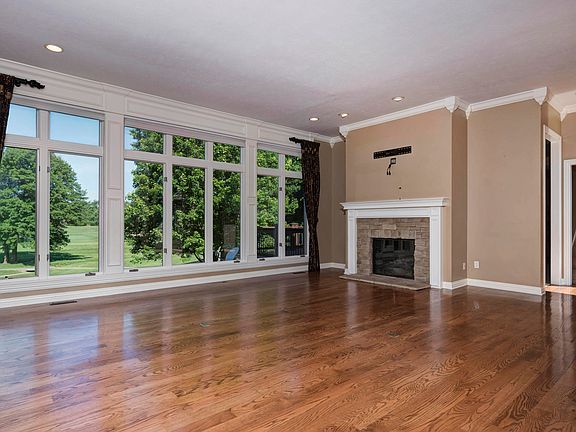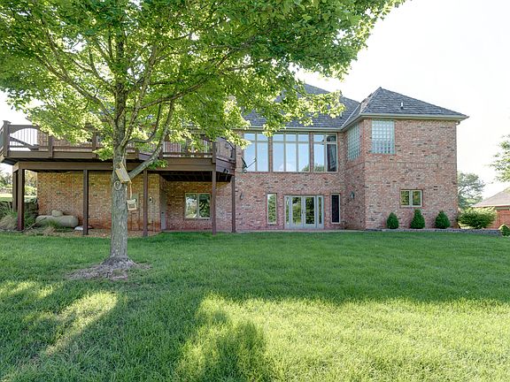 A stunning view of the golf course from a wall of windows grabs your attention as you enter this all brick walkout basement home. Admire the see-thru fireplace from the living into the kitchen eating area where you'll find wonderful built ins. The kitchen features a granite center island, tons of cabinet space & stainless appliances. The dining room boasts a 2 story vaulted ceiling w/arched window. There are 2 bedrooms on the main floor. The master has a tray ceiling & bath w/ granite countertop, walkin shower, jetted tub & walkin closet. The basement features 3 bedrooms, full bath w/ granite countertop, family room w/ fireplace, rec room with wet bar. Relax on the patio or deck, and there's even a John Deere Room perfect for a golf cart. This home has a security system & sprinkler system.