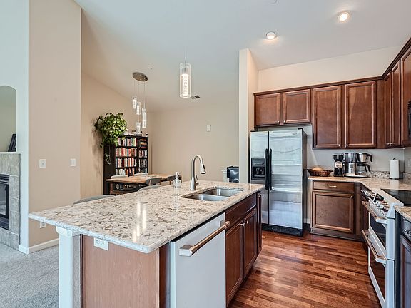 LIVE THE MOUNTAIN LIFESTYLE This contemporary second-floor condo in North Evergreen offers a stylish, inviting atmosphere with a prime location at Elk Trail in The Ridge at Hiwan. Enjoy easy access to scenic trails and all local amenities from this ideal spot just minutes from I-70. This spacious condo features a double-sided gas fireplace, carpet throughout the bedrooms and living areas, sleek modern lighting and air conditioning. The kitchen boasts beautiful hardwood floors and stunning quartz countertops, which extend to the bathrooms. A private covered balcony with southern exposure, adjacent to the kitchen, enhances the home's bright and airy feel. The large primary suite includes a five-piece bathroom and a generous walk-in closet, while the second bedroom is bathed in natural light and offers ample closet space. The attached one-car garage offers both convenient parking and ample storage cabinets for added functionality. This luxury condo is just steps away from hiking trails, schools, restaurants, markets, yoga studios, and shops, offering easy living in the heart of Evergreen! Washer/Dryer included. No smoking and no cats please. One small dog considered.