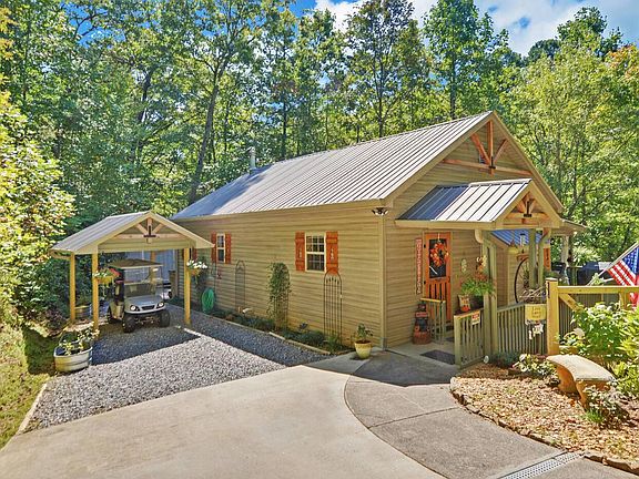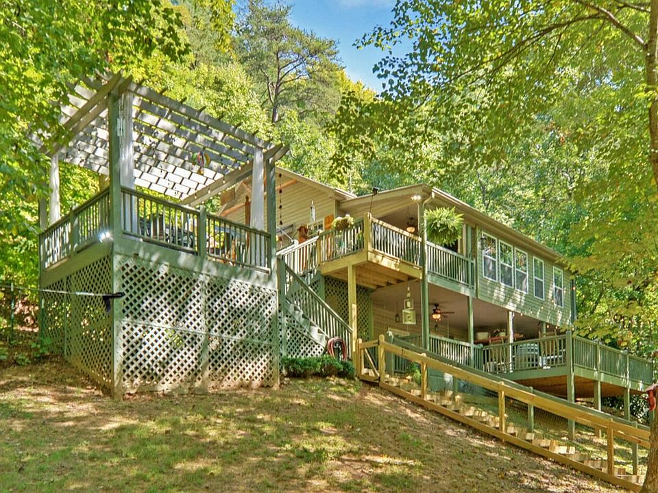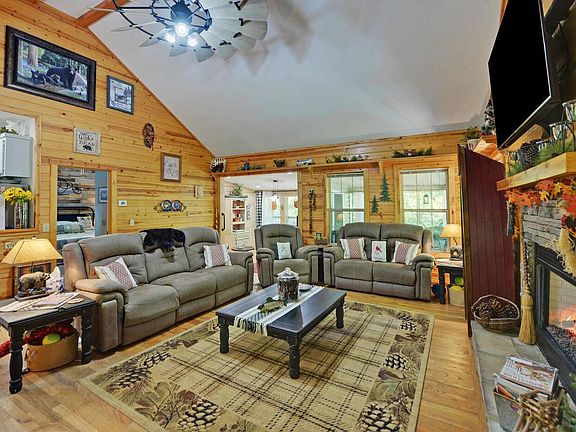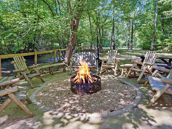 Over 400 ft on FODDER CREEK, a fast flowing trout stream! This 3 bedroom, 2 1/2 bath home, on a 2 acre park-like setting, is great for full time living or would make a fantastic VRBO! Creekside dining & living room w/gas log, stone fireplace. Master bedroom on main with his/her closets, remodeled master bath and main floor laundry room. Remodeled kitchen features quartz countertops, stainless appliances & double oven. Terrace level has an additional 2 bedrooms, full bath & family room. New Lennox HVAC installed 6/2022. Over 1,100 sf of outdoor entertaining space, 1 year old hot tub, outdoor elevator and approx 1.5 ac fully fenced. Paved golf cart path for easy access to the creekside meadow & custom golf cart shed built to match the house. SEE DOCS FOR LIST OF FEATURES