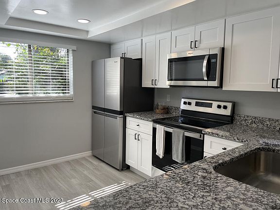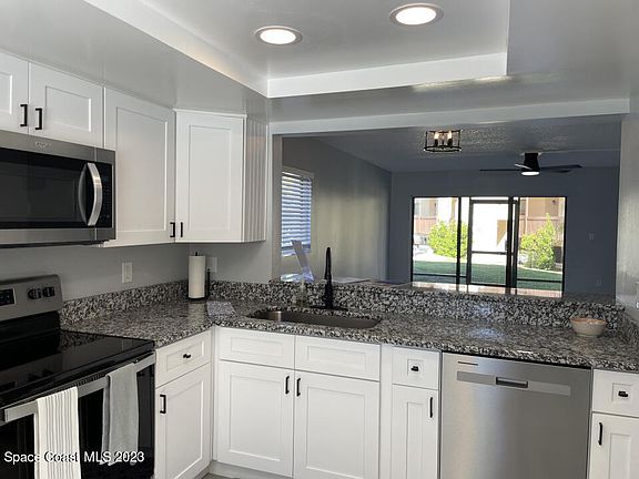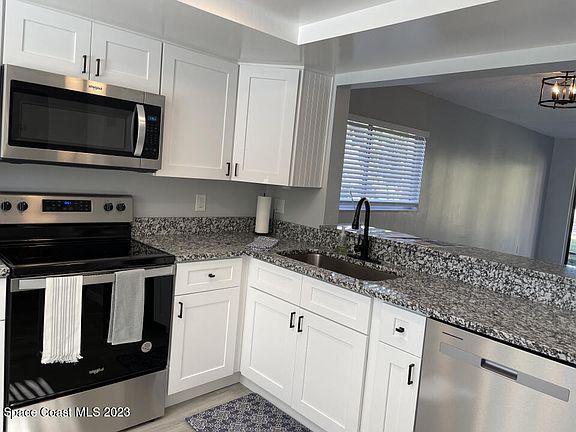 Gorgeous remodel just completed. Beautiful 2 bedroom, 2 bath first floor end unit condo in Castaway Shores. Luxury vinyl plank throughout. Eat-in kitchen has new stainless steel appliances, shaker cabinets and granite countertops. Freshly painted interior, new hardware, fans and lights. Stackable washer and dryer conveys. The condo has over 1000 square feet of living space plus a new screened in patio. Located in Palm Bay off US Hwy 1 next to the river. A couple of steps to the water and Castaway Point Park. Low HOA!
