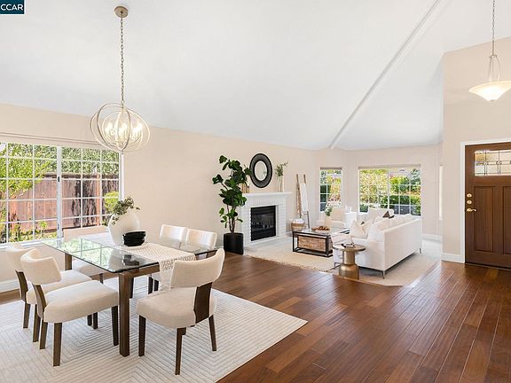 This East facing home boasts an abundance of natural light & beautiful hardwood floors throughout. The front-facing living room features a cozy gas fireplace & soaring vaulted ceilings that seamlessly transition into the formal dining room. The stunning kitchen is appointed w/an oversized breakfast bar island, top-of-the-line SS appliances, breakfast nook, tile backsplash & granite counters. The inviting family room offers high ceilings, gas fireplace & direct access to the yard creating a space for relaxation & entertaining. The spacious primary bedroom is a serene retreat, complete w/dual closets, including a walk-in with custom built-ins, & private access to the backyard. The ensuite bath is highlighted by dual sinks & a luxurious stone shower w/dual shower heads. 2 additional bedrooms down the hall share an updated hall bath. Surrounded by lush landscaping w/open space views, the flat backyard has an oversized stone patio shaded by a large pergola, wrap-around lawn & spa hookup. More highlights: laundry room w/storage, custom blinds & 3 car garage equipped w/Tesla charger, storage & workspace. Near Bishop Ranch, FWY access, & top-rated schools.