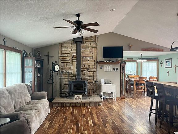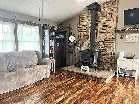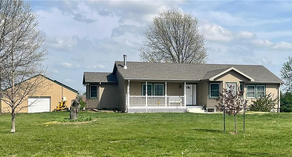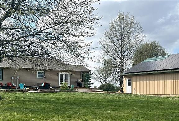 If you have been looking for a nice country home with an outbuilding and acreage on a paved road, this is it! 3 bedrooms (4th non-conforming in basement), 3 full bathrooms and 30x40 outbuilding located on 3.45 +/- acres. The vaulted ceilings on the main level create a sense of space and openness. Kitchen with island bar, dining area and stainless appliances. Master bedroom en-suite has newer heated soaking spa tub with jets, music, lighting and separate walk in shower. Convenient main floor laundry with washer and dryer included. The finished basement includes a large family/multipurpose room and non-conforming 4th bedroom or office, full bathroom and 2 car garage. Large outbuilding for all your hobbies and storage needs, with loft, concrete floor, furnace and AC, two garage doors, entry door, solar panels and pet door with outside fenced area for pets. Enjoy beautiful sunrises and sunsets from the outdoor living space including a deck, patio, fire pit, large garden and fruit trees, this property offers endless possibilities for outdoor activities and relaxation. The solar panels and wood stove make this home energy efficient. A new roof was installed in April 2024. Buchanan County R-IV (Dekalb-Rushville) School District. Only 40 minutes to KCI Airport.
