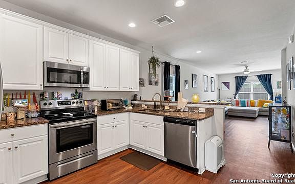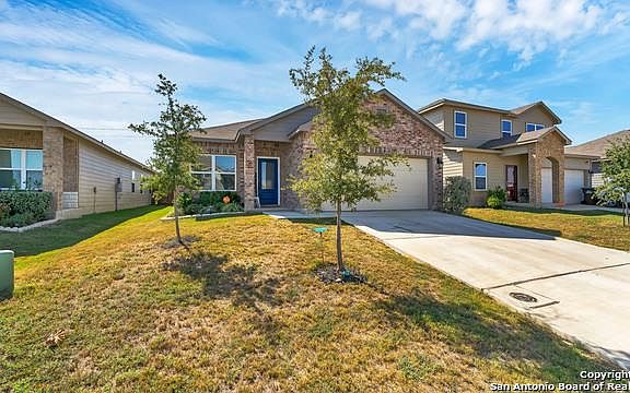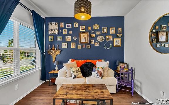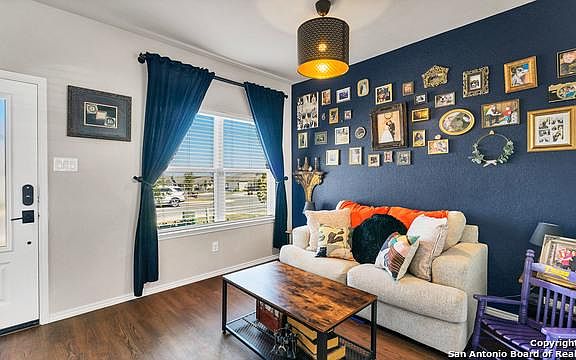 Stunning Single Story home has beautiful Granite Countertops with Breakfast Bar, Walk-in Closet, Three Bedrooms, Flex Space and 2 baths. The 2 baths have 9 foot shower curtains with circular rod which convey. This Home also features beautiful floors throughout (no carpet) and ample Counter Space and Cabinets for storage. Guest bathroom includes beautiful Board & Batten wall to include new shelves, mirror, and 9ft shower curtains and circular rod. Hugh concrete Patio (13x24) with Pergola and lights. Blu