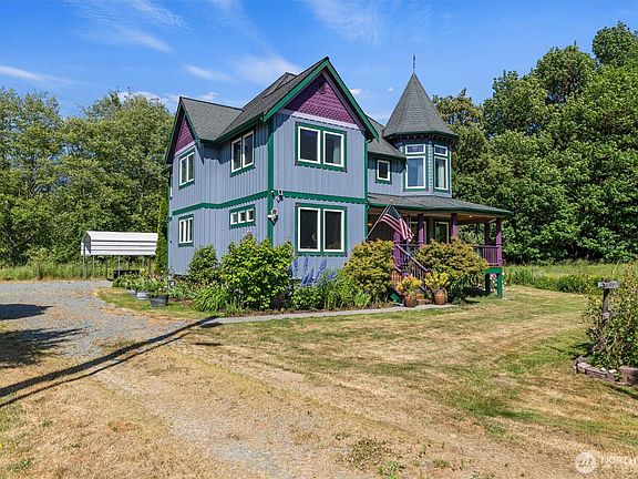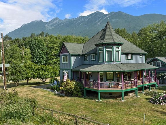 Genuine Victorian Home, custom built, on 12 acres. Stilly river frontage & surrounded by mountains. Built in 2003 and lives beautifully like an old Victorian farmhouse. Highend touches throughout. Ask for FEATURES LIST. Pastures, fruit trees, RV hookups, etc. Kitchen, dining/living rooms feature moabi woodfloors. 3/4 bath + mudrm on main. Milgard windows. Stay cool w/ AC. Generac generator. Wrought iron staircase takes you to a transcendent primary suite w/ turret, an enchanting bathroom & walkin closet. 2 more large beds + full bath. Wraparound porch w/ Alaskan yellow cedar. Bonus room above garage. 4bed septic, convert to ADU? Buildable 2nd parcel! Neighboring lots will never be developed, in conservancy. Once in a generation opportunity!