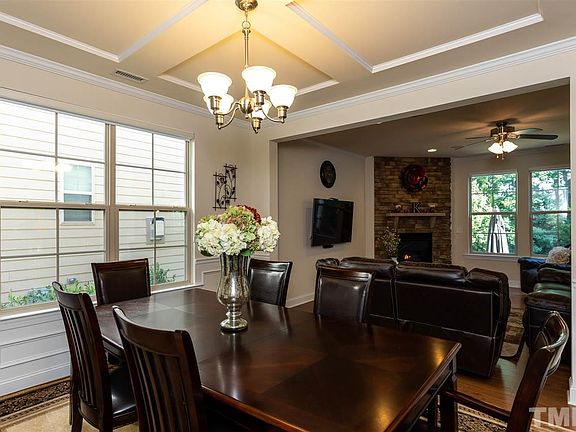 Amberly beauty on wooded lot! Fabulous floorplan features Guest Suite & BA on main. Upgraded w. flrs in Foyer, DR w/coffered ceiling & wainscoting, Family w/stacked stone FP & Brkfst. Stunning KT w/dark cabs, tile bsplash, granite ctops w/gourmet island & ss appls. Drop zone w/hooks & cubbies! Huge Pantry! 2nd lvl w/Loft, 3 add'l BR's & shared BA. Beautiful Master Suite! 3rd lvl Media/6th BR w/Full BA...Walk-in storage! S. porch & patio! Close to Award Winning Clubhouse, Pool, Gym, RTP, RDU & Schools!