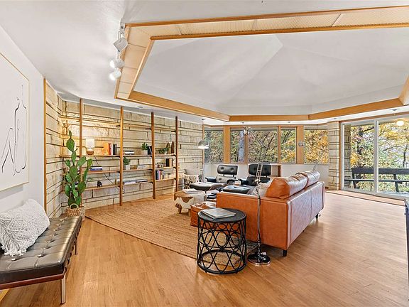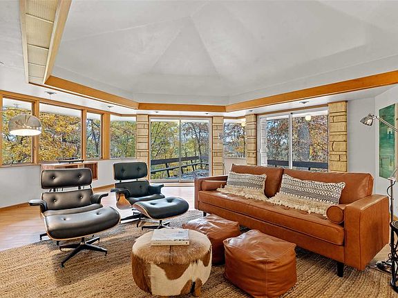 In 1959, Iowa City architect Roland Wehner designed and built an iconic Stone City limestone and California redwood home for his family. This unique Usonian-style house, influenced by Frank Lloyd Wright, is now a National Historic Place. The home features a distinctive design with hexagon-shaped rooms across three levels, connected by an open-riser hexagonal stairway. The main level includes a foyer, family room with a stone fireplace, dining area, and kitchen. The bedroom wing offers a primary bedroom with an ensuite bath, two additional bedrooms, and a guest bath. The hallway features ample built-in storage, and skylights provide natural light. The lower level contains a laundry/mechanical room with a sauna and storage. Sited on a 2.33-acre lot with an in-ground pool and hot tub, the house offers seasonal views of Rapid Creek and its valley. Its strategic window placement maximizes light and privacy. Additionally, it's conveniently located less than 10 minutes from Iowa City's amenities.