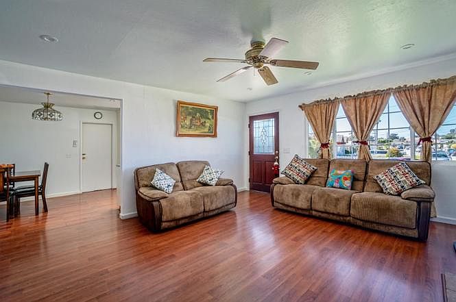 Love, love, love this light and bright, south-facing, mid-century modern, single story ranch home on a huge lot with room. Located in a Cul-De-Sac. South-facing, near Marina Vista Elementary, youll love your wood laminate floors in the living room with spacious bedrooms, closets, and an attached garage off of your eat-in kitchen. The layout is just right for entertaining and enjoying an indoor-outdoor lifestyle with an extra-large front and back yard. The yard is so large; you may decide to plant an orchard, add a tennis court or enjoy multiple vegetable gardens.Modern updates include painted interior and exterior, a new forced air heating system and double-paned windows. The attached garage offers room for your cars and/or a gym or extra space. Outside, enjoy privacy in your large fenced backyard with a nice patio to relax in your sun-belt home. Walk, roll, or drive to neighboring schools, shops, restaurants, and the beach! Appliances are available for buyers. Buyer to verify square footage.