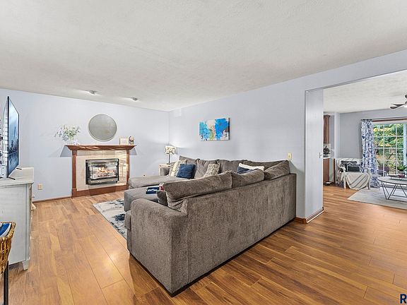 Charming 1.5 story home nestled in a southeast Sioux Falls neighborhood! Greeted by an adorable covered front porch that instantly draws you in. You'll appreciate the spacious living room with large windows & a gas fireplace for those chilly fall days & nights. The new flooring flows nicely into the functional kitchen with rich cherry cabinetry, a pantry, a center island & quartz countertops & the dining room with a slider to the patio. The main level is complete with the master bedroom with a walk-in closet & a pass-through full bathroom with handy laundry. Up the steps lies a loft area, 2 additional generous sized bedrooms both with walk-in closets. Step down to the large family room, a 4th bedroom, 3rd bathroom, & utility/storage room. Top it off with an oversized 2-stall garage, mature landscaping, an impressive patio & a hot tub to relax after a long day. This home is a true gem!