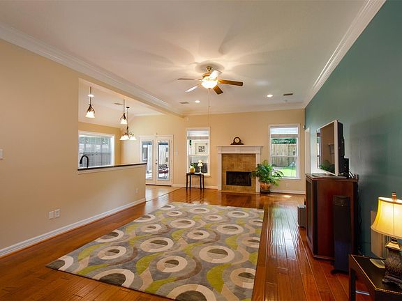 Beautiful, energy efficient one story 3 bedroom 2 bathroom with 2 car attached garage. Open and airy split floor plan, tile entry way, high ceilings, double pane windows, air purifying system, plant ledge, gas log fireplace in the family room, engineered wood floors in the Livingroom, master bedroom and hall way, tiled kitchen, breakfast and bathrooms. French doors lead out to the oversized covered patio with a built in gas log fireplace and fully fenced sizeable backyard. You will find some crown molding, window coverings and ceiling fans. The primary bathroom offers double sinks, a soaker tub, separate shower and a walk in closet. The third bedroom is currently used as a study and it has a built in desk. The back yard offers some privacy, which is protected by the HOA includes a sprinkler system and a French drain. Walking distance to park and pool.
